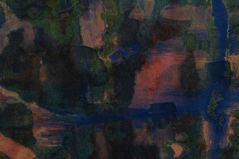 イメージはしばしば失われ、時に再発見される。絵が進むにつれ、他のドローイングやイメージが登場することもあるが、最も重要なのは、絵画の論理が優先されることだ。あるレイヤー/アクション/決断は、最後のアクション/レイヤーとの関係においてその指示を受ける。絵画は、手がかりを見つけ、それに従うことと、振り返り、観察された特定の瞬間を思い出すことのバランスをとる行為なのだ。 墨はこの思考を補完する。さまざまな不透明度で塗られた墨は、絵画の中で以前起こった瞬間を隠すと同時に明らかにする働きをする。それは、暗い空間に入ったとき、目が暗闇に慣れるにつれて、より多くの形や色が姿を現すのに似ている。