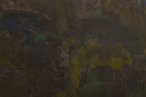 「mosslight」を例に取ろう。絵の具はキャンバスの裏と表の両方から塗られ、非常に薄い天竺木綿を透過して、元の痕跡の記憶を浮き上がらせている。 流れるような黒い線は、畳によってつけられた白い跡に溶け込む。目が慣れてくると、緑と黄色の形がだんだん見えてくる。名前をつけるのは難しいが、何かを見ているような、心に記録されたような、はっきりとした存在感がある。制作の過程で、どの層がいつ描かれたのかを読み解くことはほとんど不可能だ。